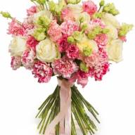 Этот стильный и красивый букет состоит из нескольких роз, гвоздик и лизиантусов. Розовые гвоздики символизируют очарование и поддержку, на которую можно рассчитывать, обращаясь к вам. Белые розы показывают чистоту намерений и отсутствие корысти. А лизиантусы выражают спокойствие и восхищение внешним видом. Любая женщина обрадуется такому букету.