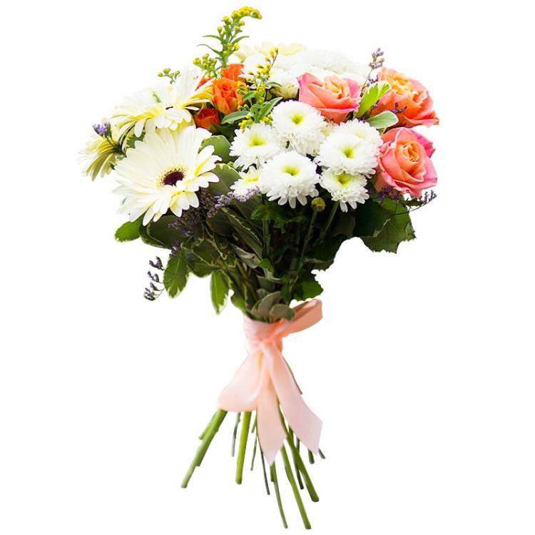 Великолепная цветочная композиция «Встреченная в поле» излучает собой сладкий, манящий аромат и невероятное тепло долгожданного лета. Собранные воедино с помощью розовой ленточки нежные хризантемы, ароматные розы, крупные герберы и декоративная зелень смотрятся достаточно привлекательно и оригинально.